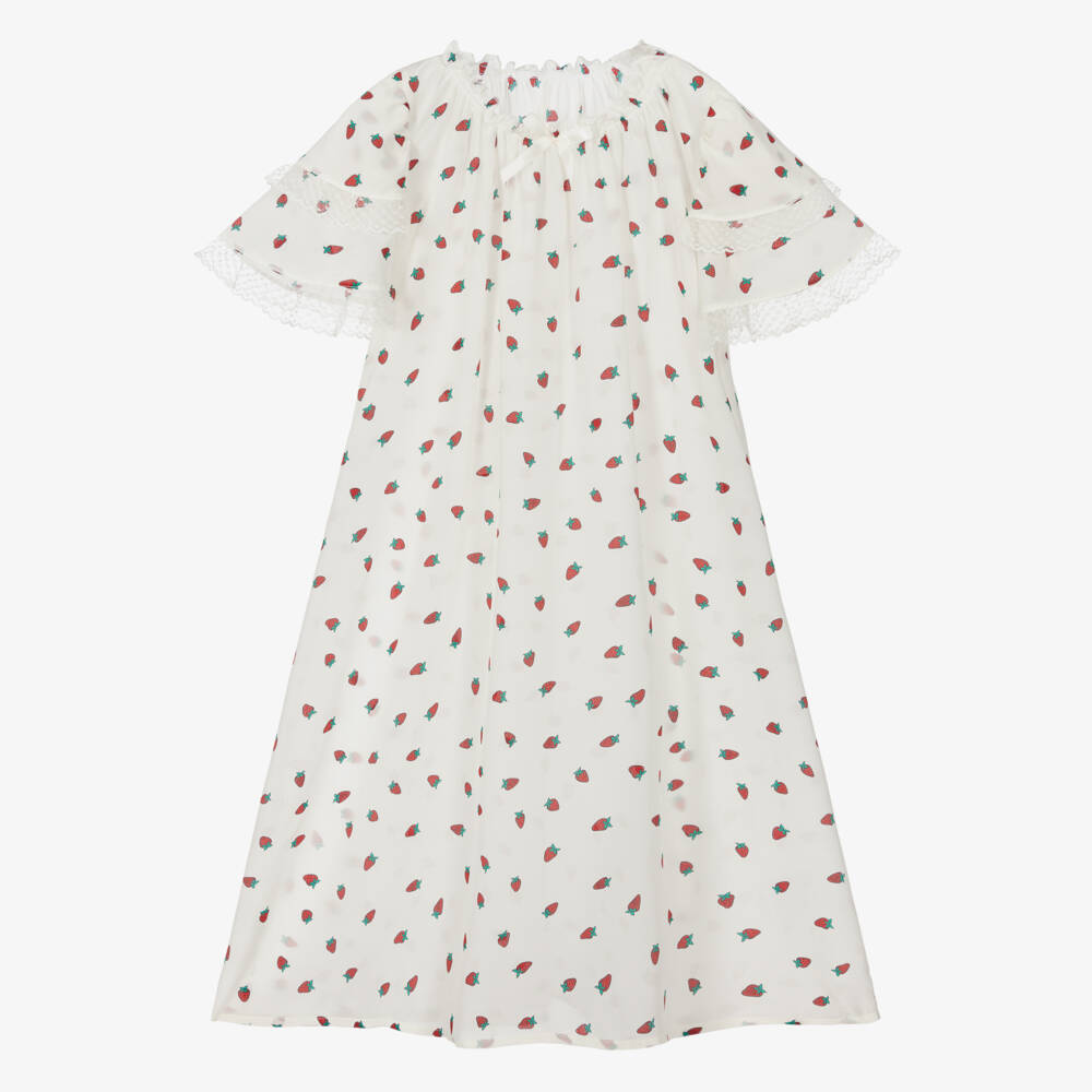 Luxurious ivory silk nightdress for teen girls by AMIKI Children, with a charming red strawberry print. Soft and lightweight, it has delicate lace trims and a gently elasticated neckline with a ribbon bow detail, and falls in soft gathers for comfort.