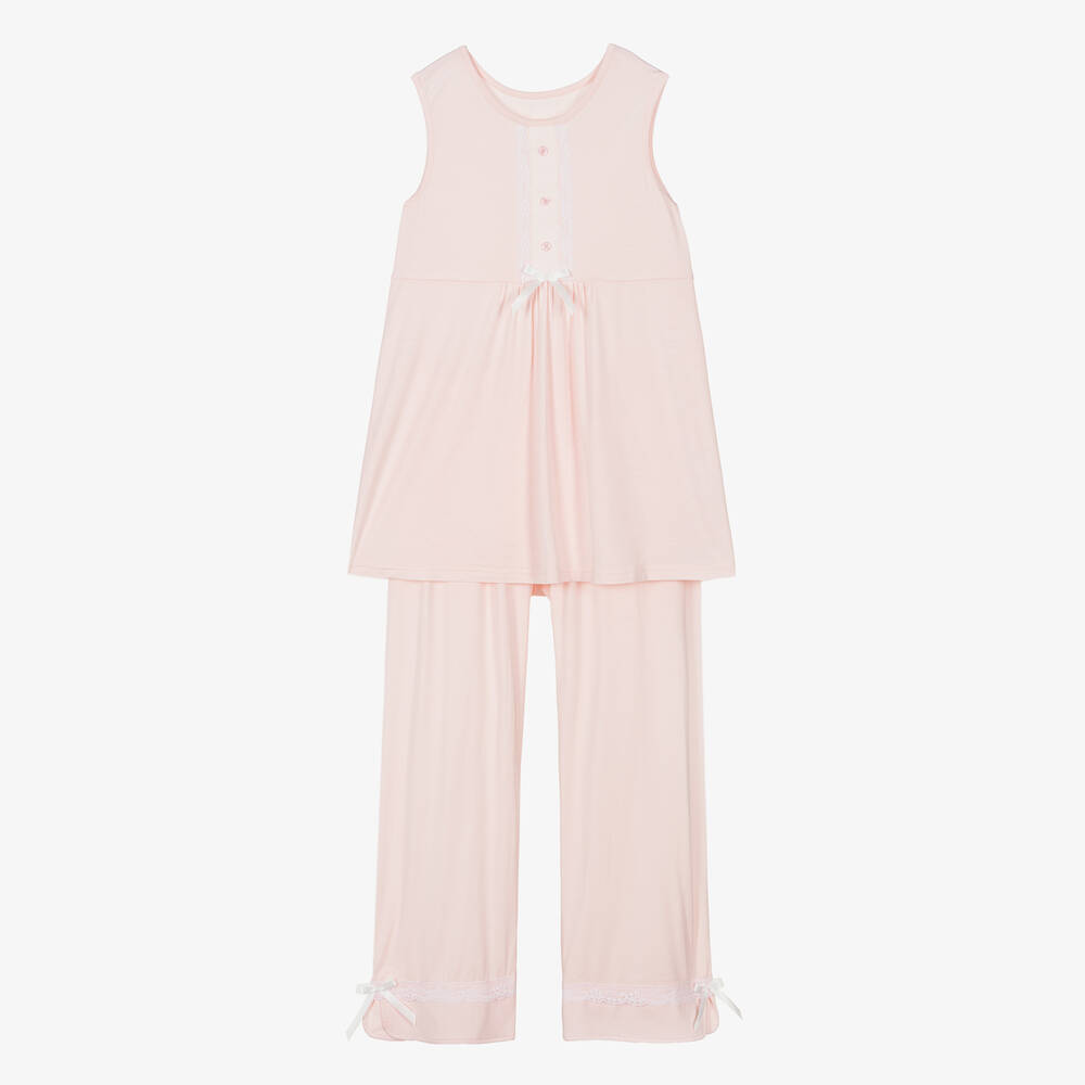 Comfortable for sleeping and lovely for lounging, these pale pink pyjamas for teen girls are by AMIKI Children. They are made in luxuriously soft micromodal jersey, trimmed with elegant white lace and satin bow trims. Designed to be loose fitting, they allow for complete freedom of movement. The top has decorative buttons on the front grosgrain panel, and the long bottoms have a gently elasticated waist.