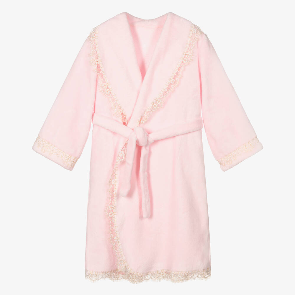 Designed by AMIKI Children, a pale pink dressing gown for teen girls. Luxuriously soft and comfortable, this loose-fitting bath robe is made in fluffy fleece with delicate ivory and gold lace edging for a touch of timeless glamour. Lovely for lounging, a removable belt can be tied around the waist to keep it secure.