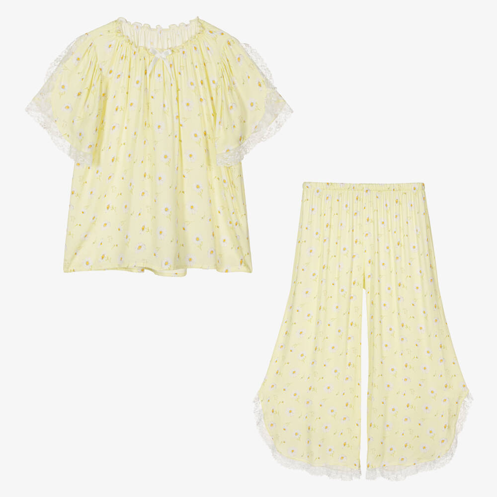 Pale yellow pyjamas for teen girls by AMIKI Children, patterned in a beautiful daisy print. These elegant pyjamas are made in silky soft viscose for a comfortable feel on the skin. Detailed with delicate white lace and a satin bow on the neckline, they have gently elasticated trims.
