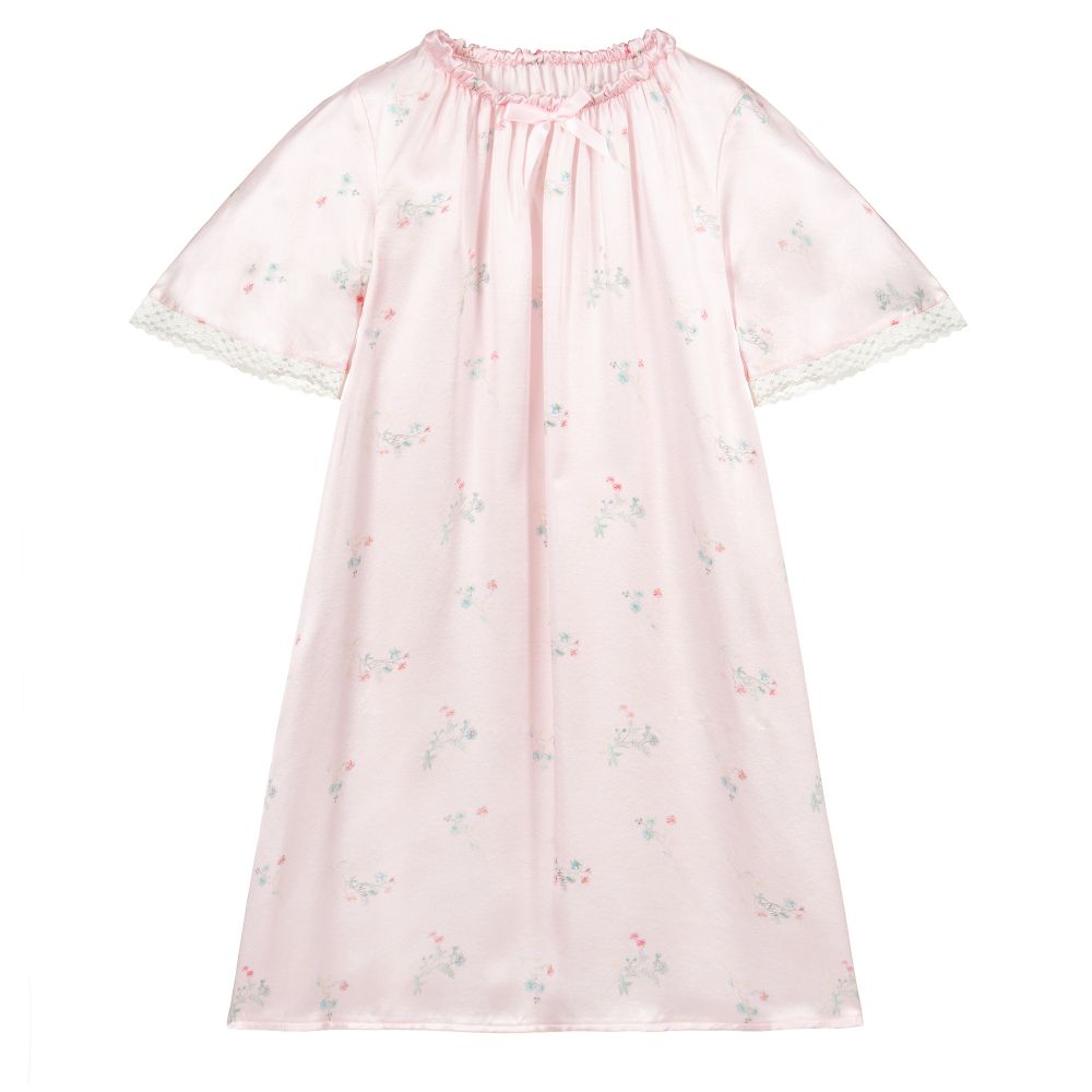 A luxurious pink silk nightdress for teen girls by AMIKI Children, with a blue floral pattern. Soft and lightweight, it has dotted lace trimmed sleeves and an elasticated neckline.