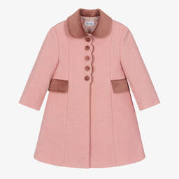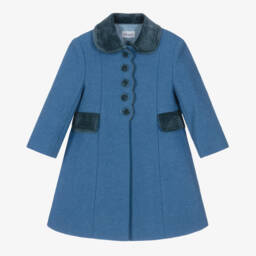 Classic navy blue coat for girls from Spanish brand Ancar, made in luxurious wool. For a traditional heritage look, it has a stitched velvet collar and pocket flaps, with matching covered buttons and a scalloped trim. It is designed with smart inverted pleats on the back for both style and ease of movement and has a beautiful tonal satin lining for comfort. Smaller sizes come with a matching bonnet, which neatly attaches to the coat.