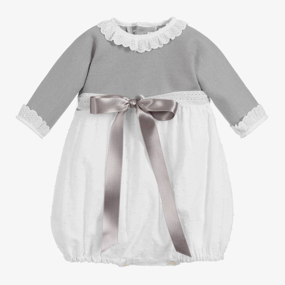 Grey and white shortie for little girls by Ancar. The top is knitted in a soft cotton and polyester blend with button fastenings on the back. The white shorts are made in lightweight plumeti cotton, and fasten with poppers between the legs. There is a detachable broderie anglaise and satin ribbon around the waist.