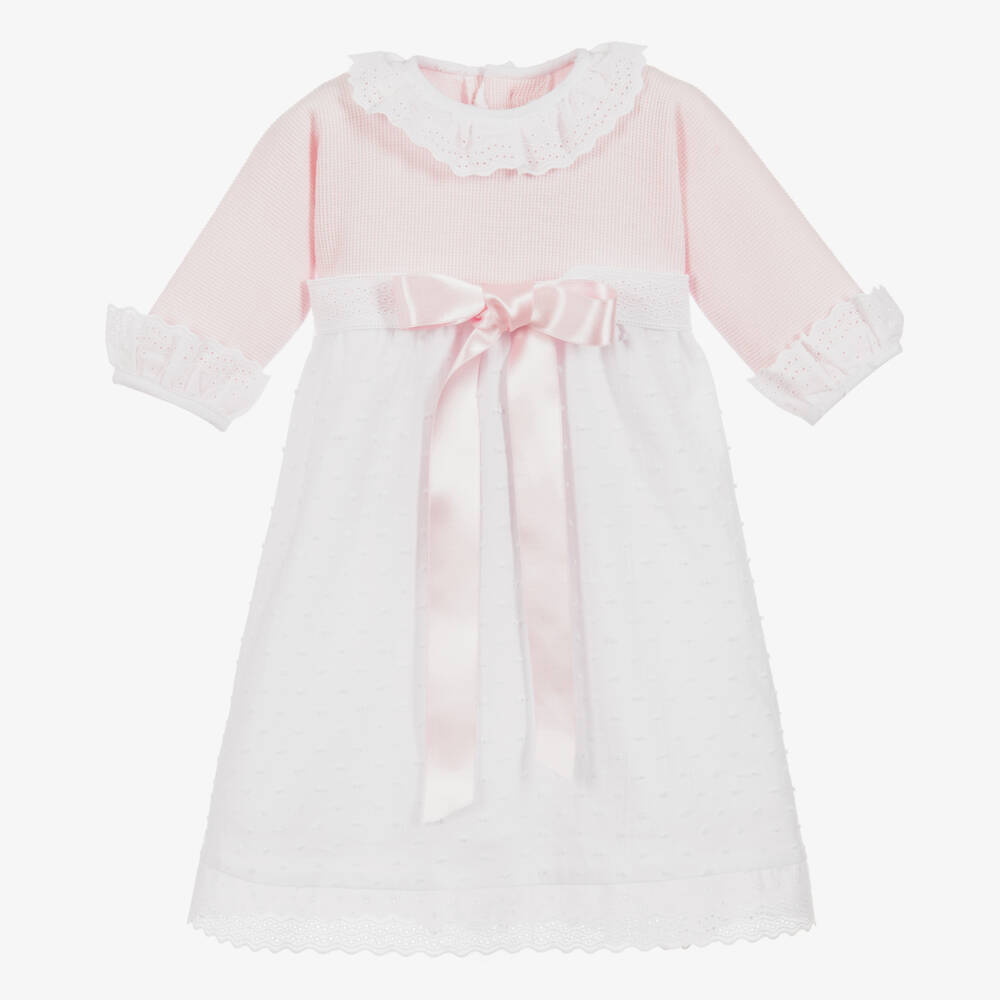 Lovely for baby girls, a pink and white day gown, designed by Ancar. The top part is soft and knitted, with sweet ruffle trims. The lightweight plumeti skirt has a raised dots pattern, with a detachable silky ribbon tie around the waist. Baby can wear as a day dress, or for a more special occasion.