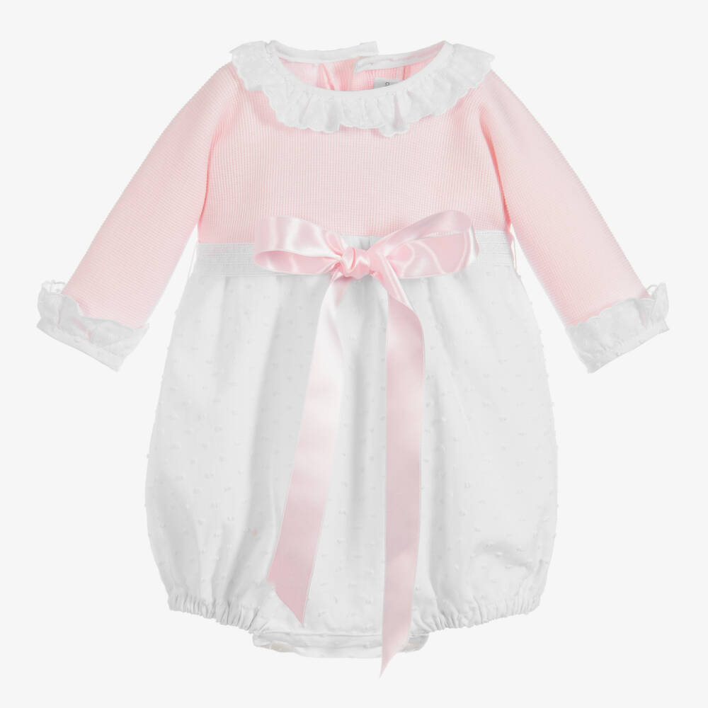 Pink and white traditional-style shortie for baby girls by Ancar. It is made in soft cotton blend, in a comfortable bubble shape. With elasticated legs and buttons down the back and underneath, it ties with a detachable, satin bow belt.