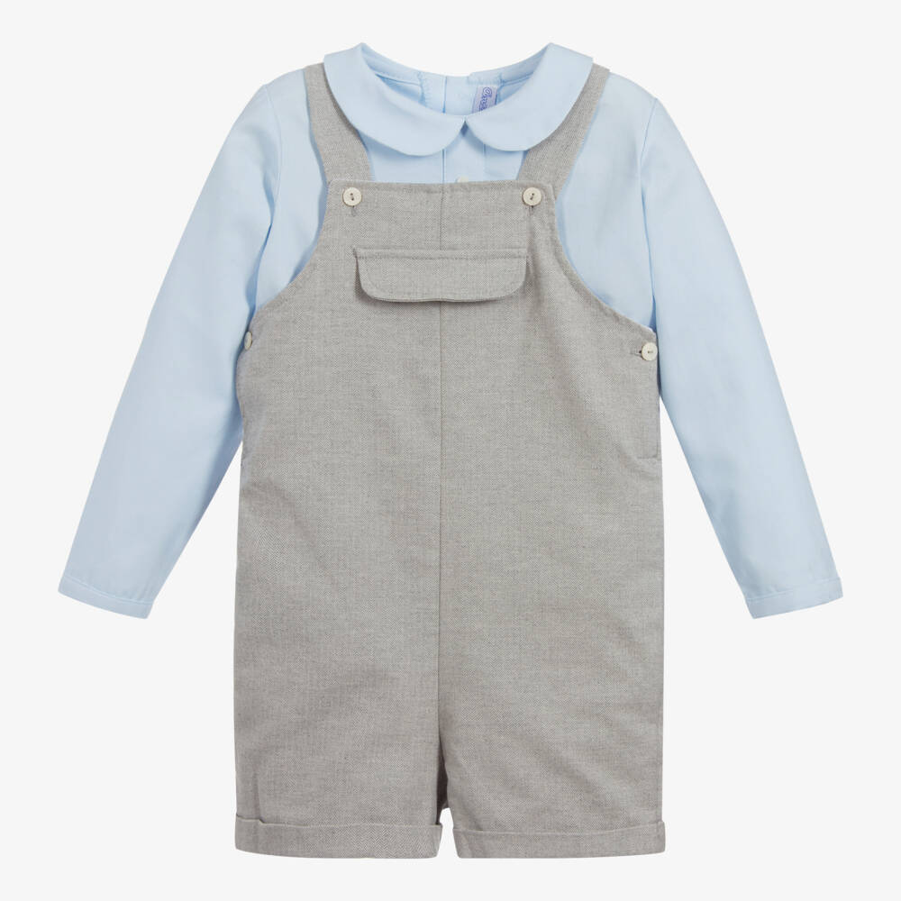 Smart dungaree shorts set for little boys by Ancar, made in soft cotton. The pale blue shirt has a round collar, with back button fastenings. The grey shorts have a smart herringbone pattern and a lightweight lining cotton lining.