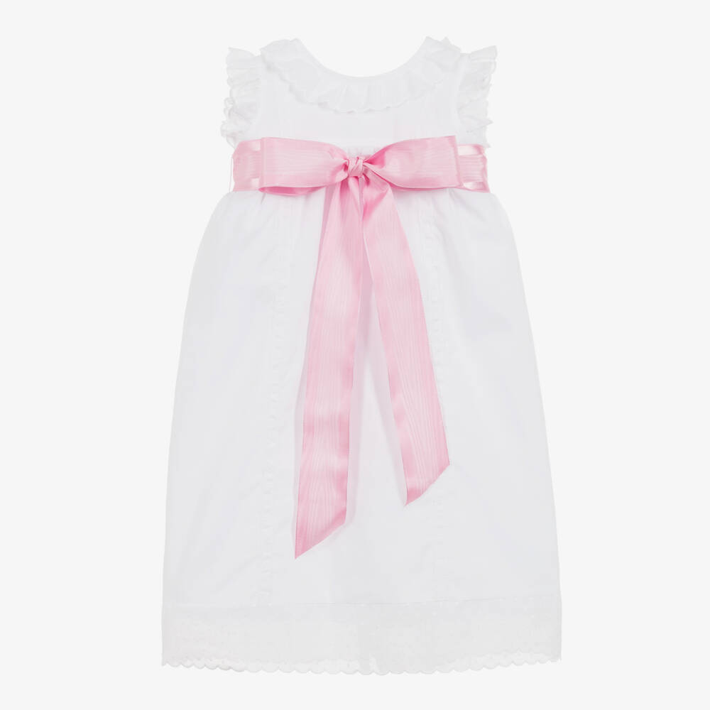 Beautiful white full length day gown by Ancar for newborn baby girls. It is made from a soft, lightweight cotton with delicate ruffles on the neckline and sleeves. Fully lined, it has a crossover button fastening at the back and detachable pink ribbon belt tied around the waist.