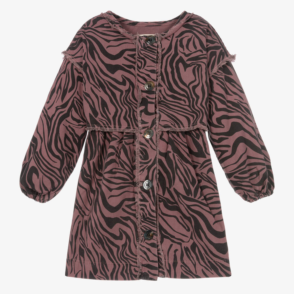 Patterned in an eye-catching animal stripe, this plum pink dress for girls is by Andorine. It is made in soft twill fabric and has frayed edges for a cool and contemporary look. The cuffs are gently elasticated and it fastens with buttons down the front.