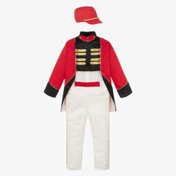Ideal for special occasions, a navy blue and white military-style suit for younger boys by Andreeatex. With a lightweight lining, the long-line jacket has ornate gold trims, decorative gold buttons and a stand-up collar. It fastens with concealed buttons and popper on the front. The white satin trousers are lined in soft cotton and have an adjustable, elasticated waistband. There is a gold trim down each leg and a blue panel on the front for a coordinated look. A classically styled long-sleeved shirt, along with a matching blue hat completes this smart outfit.
