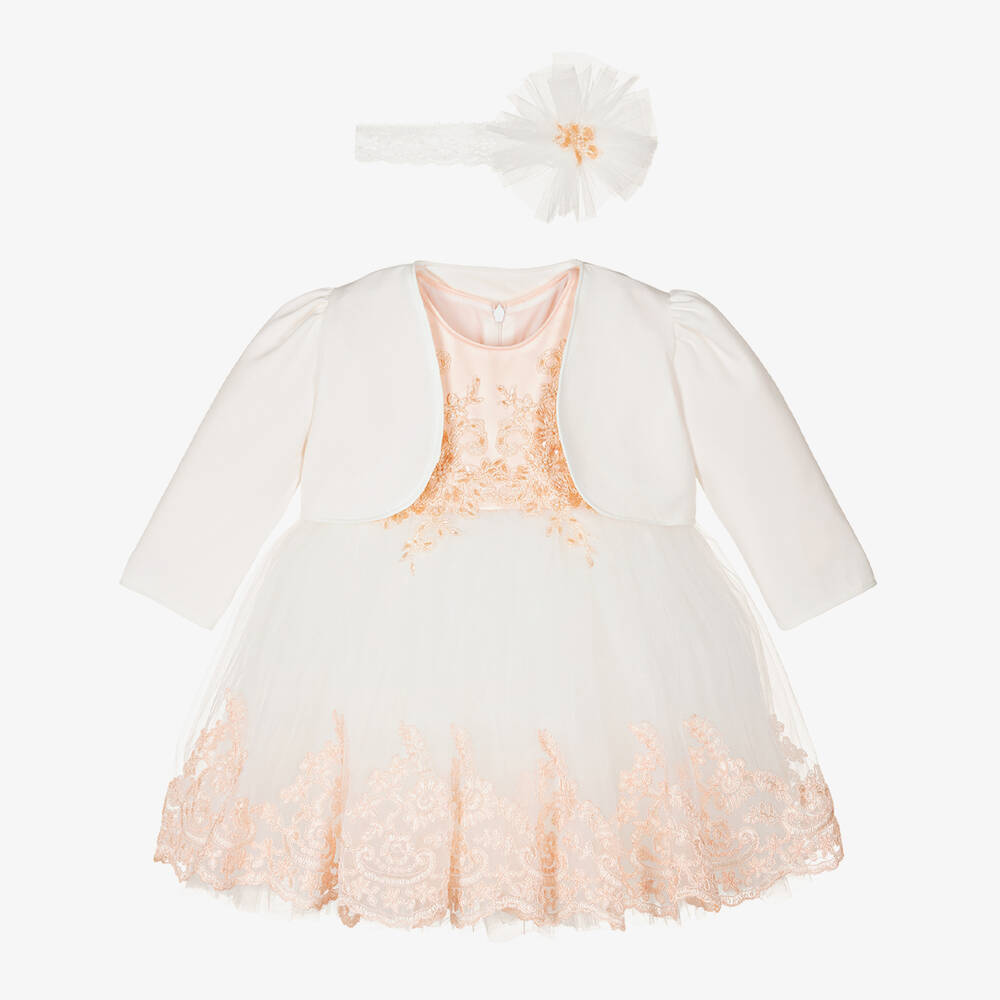 Ivory and pink special occasion dress for little girls from Andreeatex. The satin bodice has a pretty pink lace trim with pearls and the tulle skirt has matching lace. This lovely set comes with a matching headband and an ivory crêpe satin bolero jacket. Smaller sizes come with satin knickers.