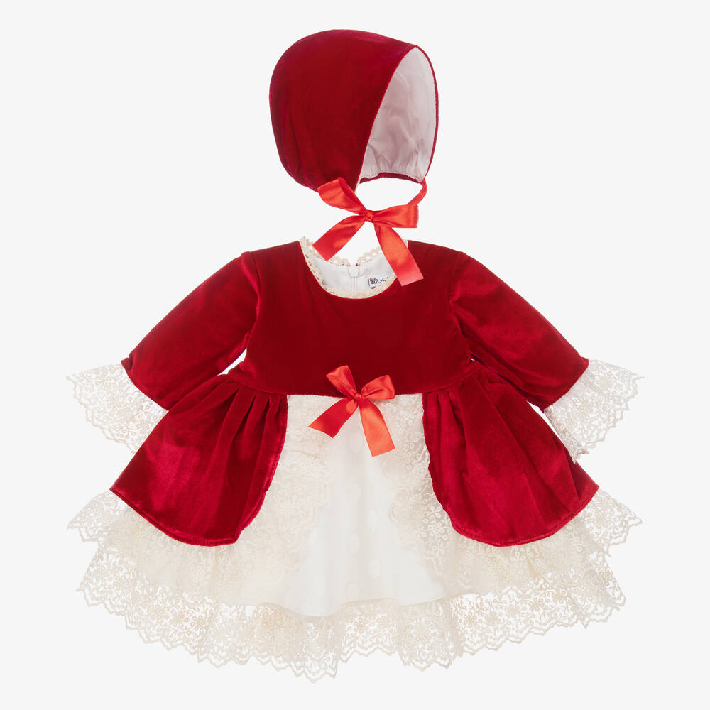 Girls red dress and bonnet set from Andreeatex, made in a super soft velvet with ivory lace ruffles. There is sweet ribbon trim on the waist and the layered skirt is shaped at the front to reveal the dotted tulle underlayer. It is lined with lightweight cotton for comfort and has a concealed back zip fastening for a neat finish. This beautiful special occasion dress is completed by a matching bonnet.