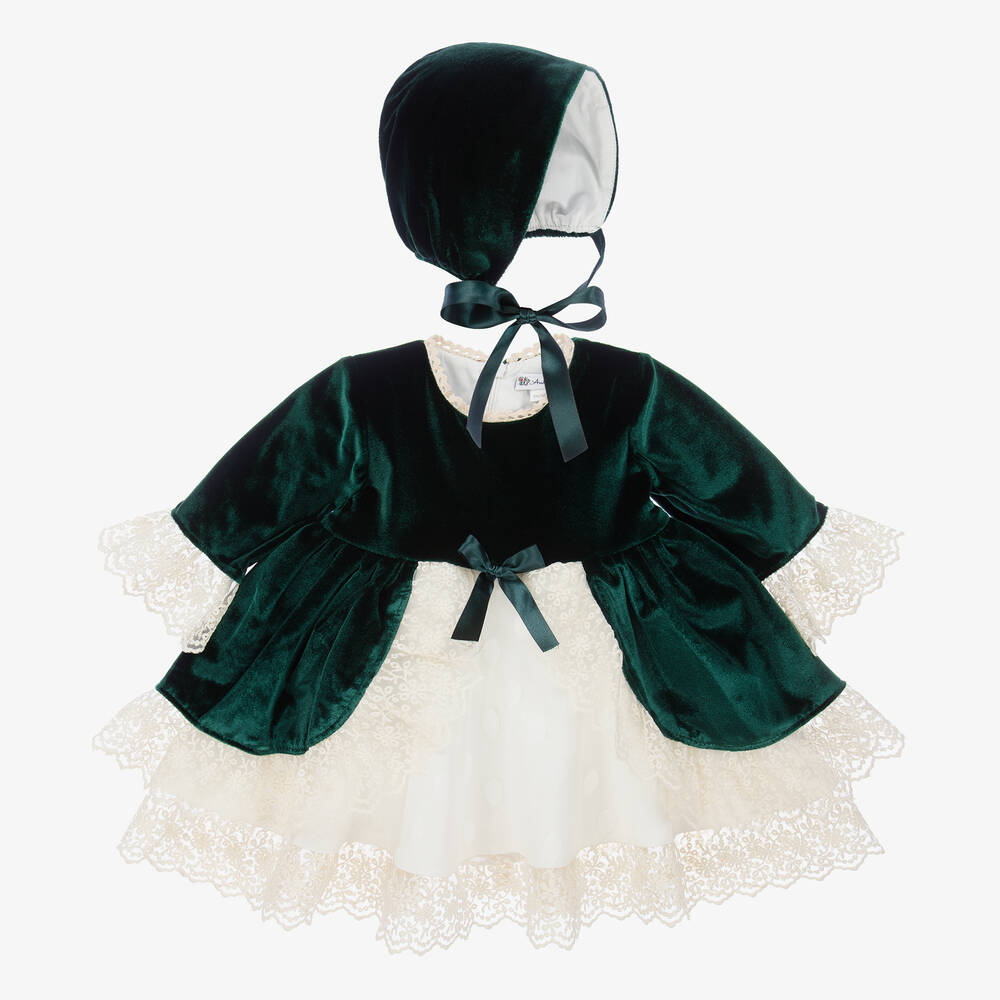 Girls emerald green dress and bonnet set from Andreeatex, made in a super soft velvet with ivory lace ruffles. There is sweet ribbon trim on the waist and the layered skirt is shaped at the front to reveal the dotted tulle underlayer. It is lined with lightweight cotton for comfort and has a concealed back zip fastening for a neat finish. This beautiful special occasion dress is completed by a matching bonnet.