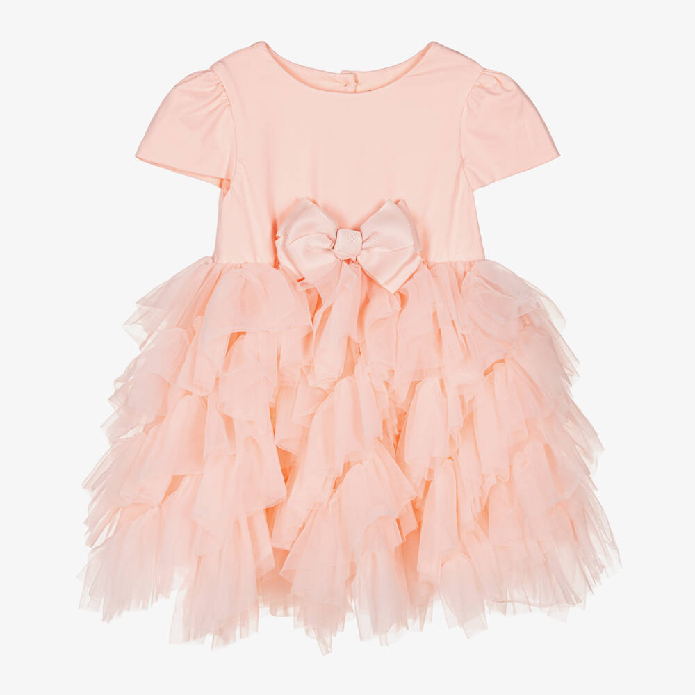 Stunning pale coral pink dress for baby girls by Angel's Face. The comfortable cotton jersey bodice has little capped sleeves and golden buttons to fasten on the back. Generous layers of fine tulle are ruffled in asymmetric tiers to create a voluminous skirt, with a soft jersey lining underneath for comfort and a lovely grosgrain bow for a sweet finishing touch.