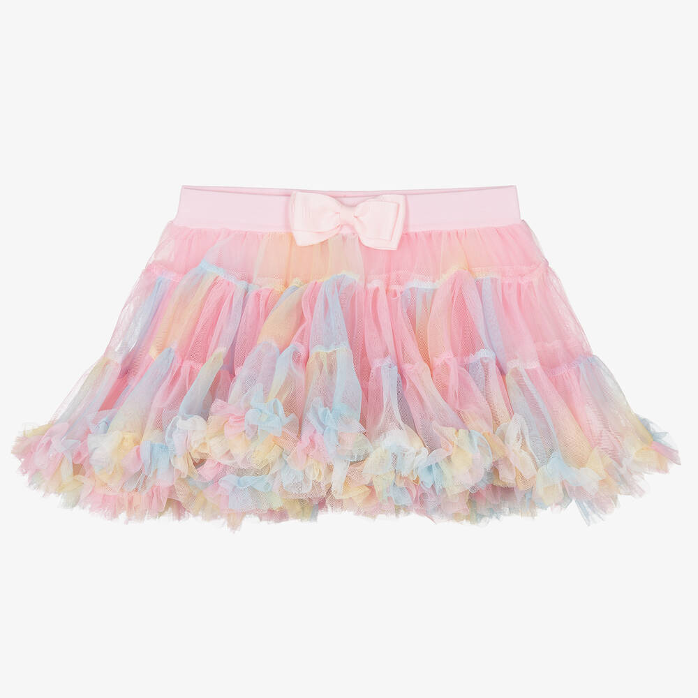 A stunning pastel rainbow-coloured tutu skirt for baby girls from Angel's Face. This voluminous tiered skirt is made in soft tulle, with a pale pink grosgrain bow detail on the front. The pink elasticated waist and lining are made in soft cotton jersey, comfortable on delicate skin and tiny tummies.