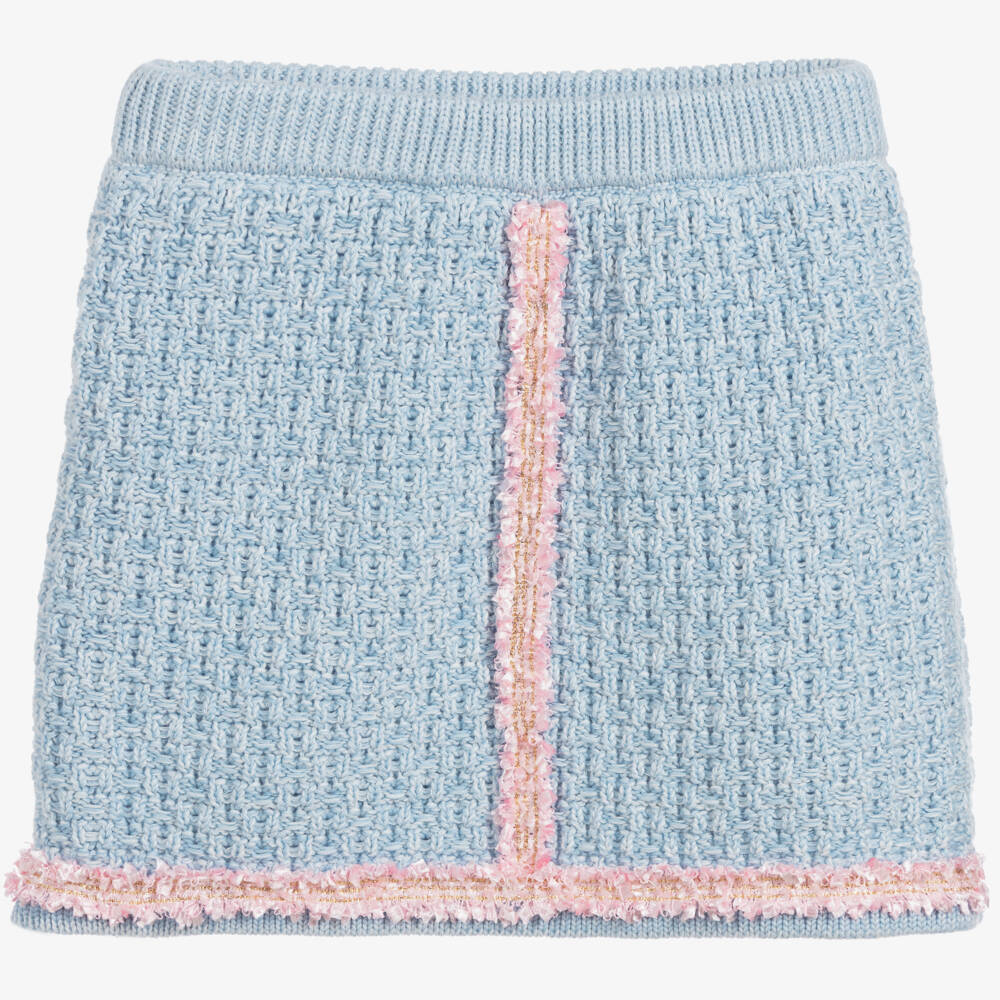 Pale blue knitted cotton skirt for girls by Angel's Face. Down the front and along the hemline is a shiny, frilly pink trim with gold stitching. The skirt is fully lined in comfortable jersey and has an elasticated waistband.