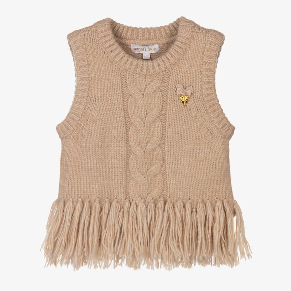 Gorgeous beige slip-over for girls by British brand Angel's Face, with the designer's signature golden heart charm and grosgrain bow in beige on one side. Made in a super soft, mid-weight knit with a touch of wool, it has a cable knit pattern on the front and chunky ribbed trims. Rows of tassels around the hemline give the tank top extra designer style.