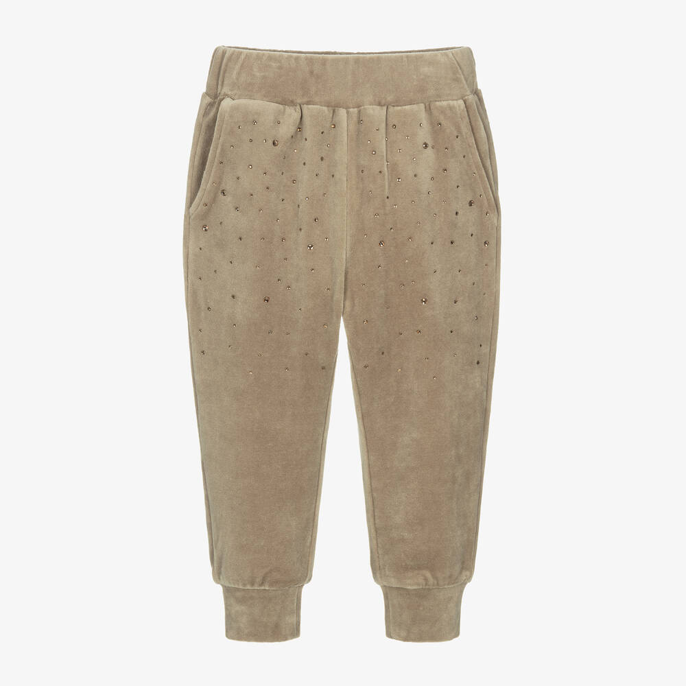Glamourous beige joggers for girls by Angel's Face, sparkling with gold rhinestones. Endlessly comfortable, they are made in soft cotton velour and have an adjustable waist for a great fit. There are useful, slanted pockets on the front.