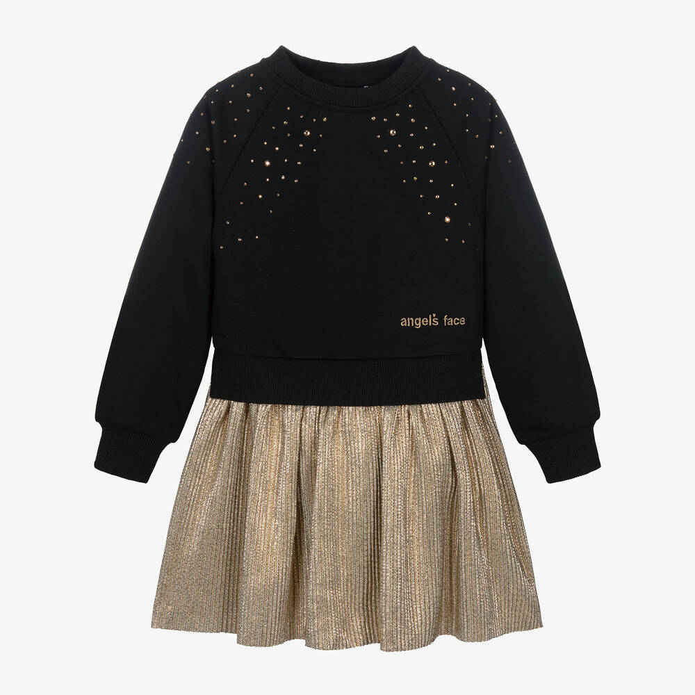 Sparkling with gold rhinestones, this black and gold dress for girls by Angel's Face is ideal for both parties and daywear alike. With the appearance of a two-piece, it has a black cotton sweatshirt top part and a gathered, pleated jersey skirt in shimmering gold.