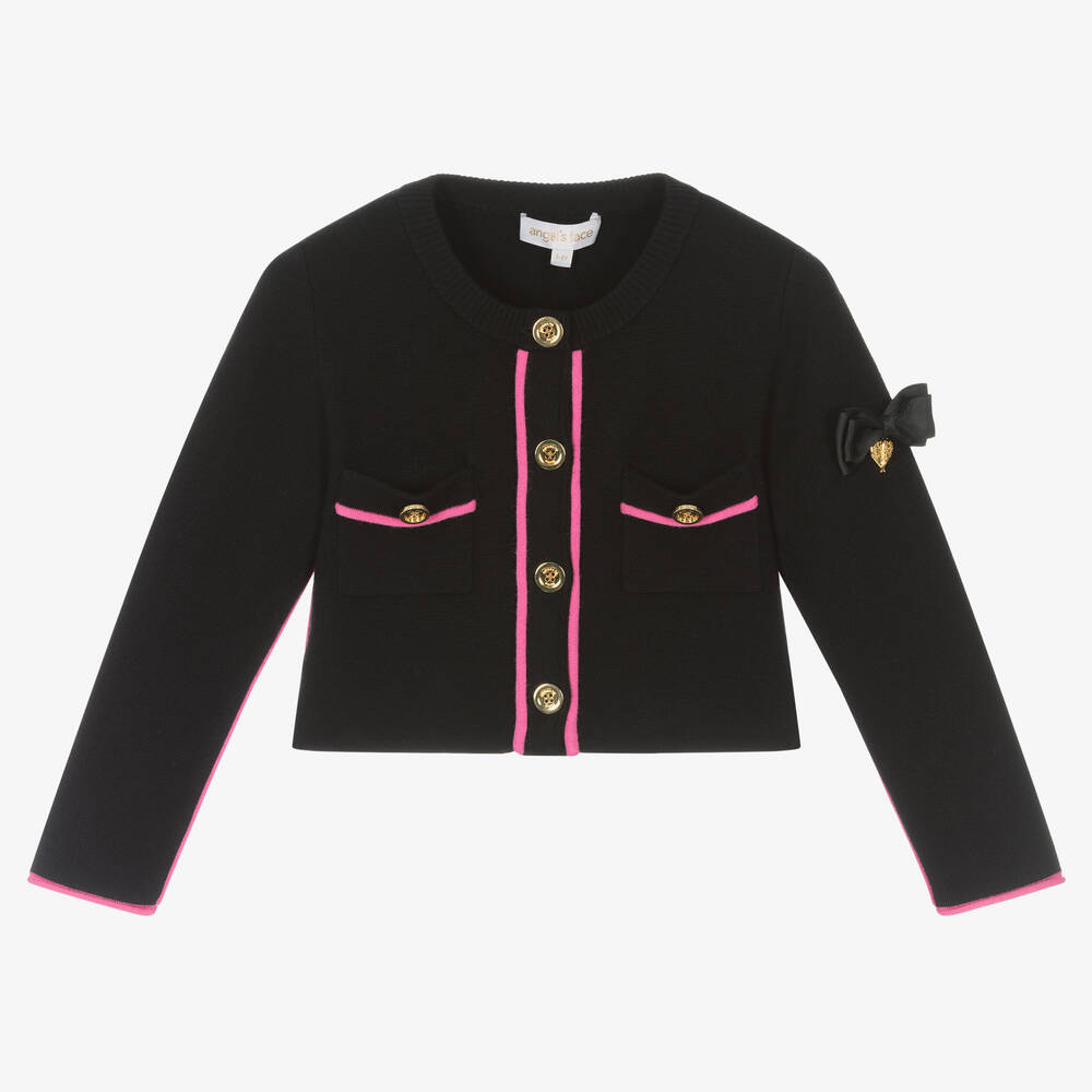 Smart black cardigan for girls by British label Angel's Face, with vibrant pink trim for a lovely contrast. Made in a luxuriously soft viscose blend knit, it has a ribbed crew neck, front pockets and a cropped fit. Shiny gold-tone branded buttons give a stylish finish and the brand's signature heart charm and grosgrain bow can be seen on one sleeve.