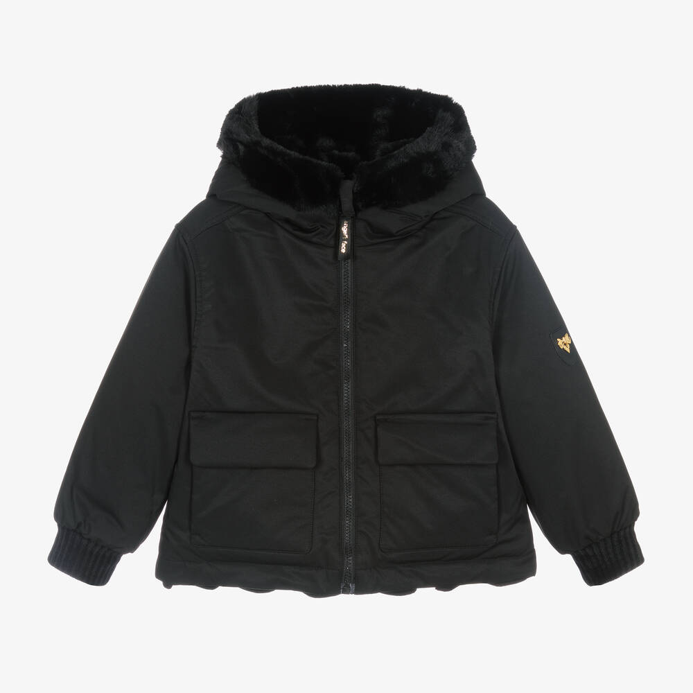 A gorgeous reversible black jacket for girls by Angel's Face, with a fixed hood. One side is made in luxurious plush faux fur with a frilly hemline and slanted front pockets. The other side is in smooth twill fabric, with flap patch pockets and the brand's golden bow and heart emblem on one sleeve. There is an exposed front zip fastening and soft ribbed cuffs.