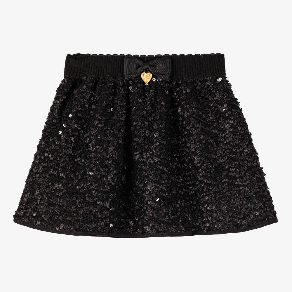 In elegant black, this special occasion skirt for girls is by British brand Angel's Face. Lovely for a party, the lightweight fabric is covered in sparkly sequins for an eye-catching look. Lined in comfortable cotton jersey, the skirt has a ribbed elasticated waistband, trimmed with a grosgrain bow and golden hearts charm for a signature designer finish.