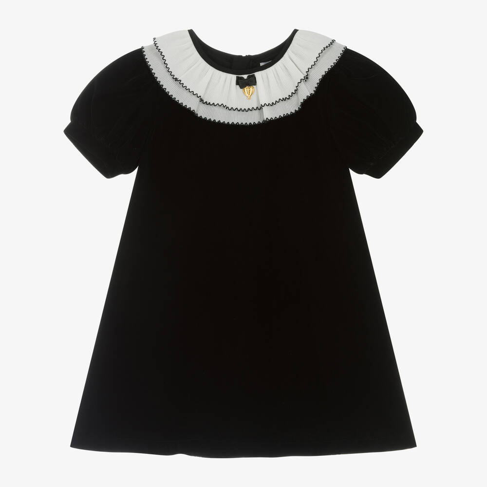 Smart black velvet dress for girls by British brand Angel's Face, ideal for a special occasion. Beautifully soft, it has a layered, white pleated crêpe collar with an embroidered black trim and the signature grosgrain bow and golden heart charm in the centre. Fully lined for comfort, it has short puffed sleeves and a concealed zip fastening on the back.