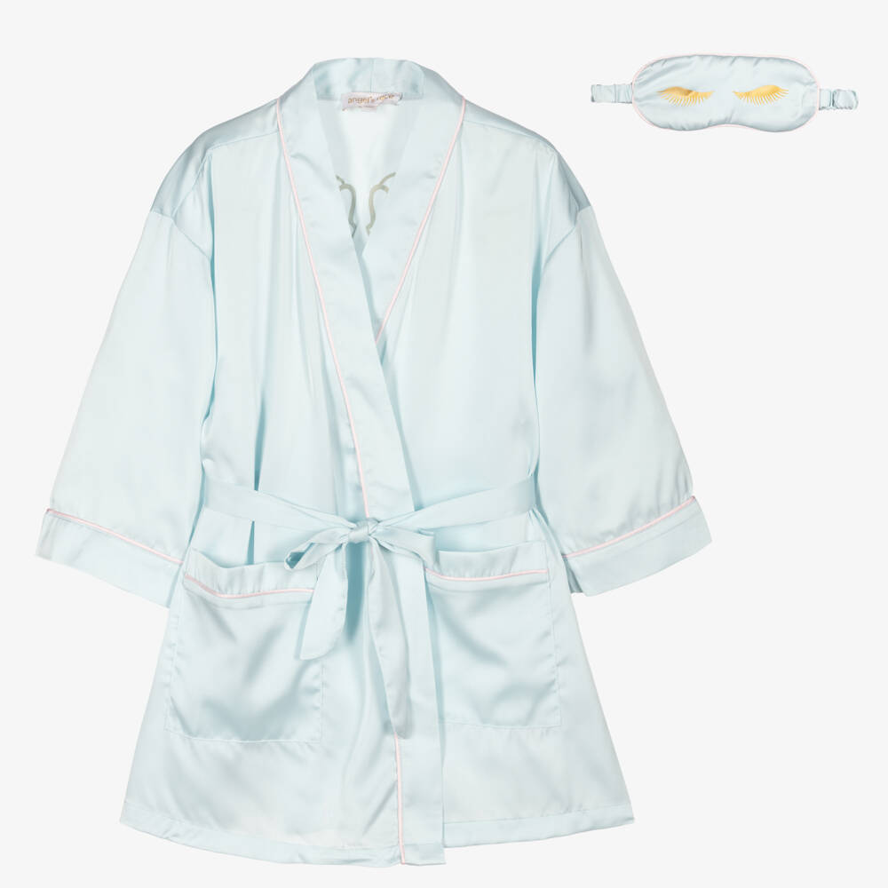 Blue dressing gown and eye mask set for girls by Angel's Face, made in silky polyester satin, with pink piping trims. It has patch pockets, an attached tie belt, which is elasticated at the back and the brand's iconic gold angel wings printed on the back. The padded eye mask has an adjustable, elasticated strap and gold eyelashes printed on the front.