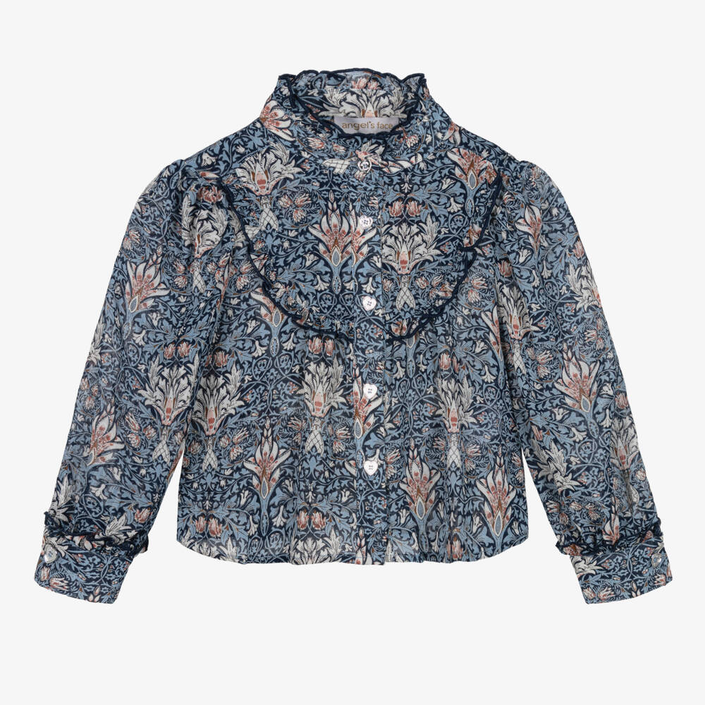 Beautiful blue blouse for girls by Angel's Face with an intricate filigree floral pattern in blue, white and pink and a touch of glitter sparkle. Made in sheer chiffon, this smart blouse has pretty ruffle trims on the stand-up collar, front, back, and cuffs. To complete the designer look, it fastens with silver-tone branded heart buttons.