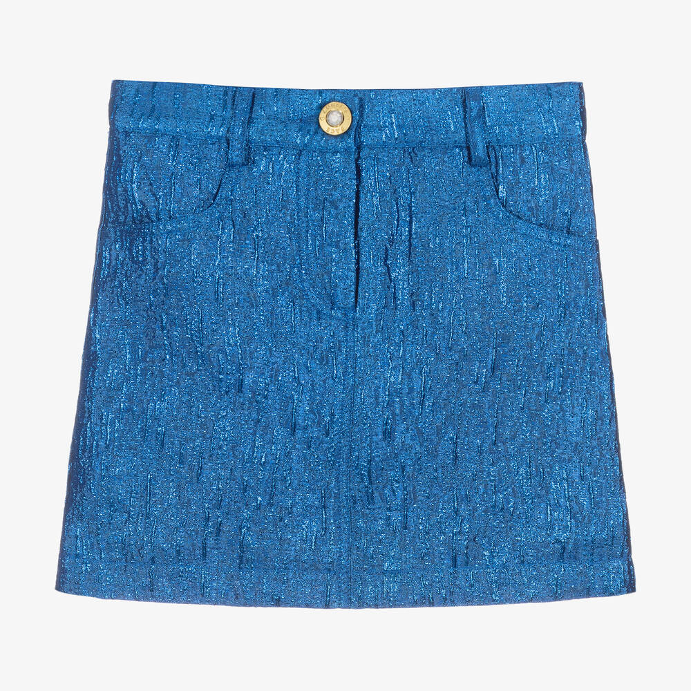 Girls eye-catching metallic blue skirt by Angel's Face, ideal for a party or for elevating an everyday look. The skirt glistens with a tonal blue jacquard pattern and has a shiny golden branded button fastening with a central crystal. There are four useful pockets, and an adjustable waist giving a good fit.