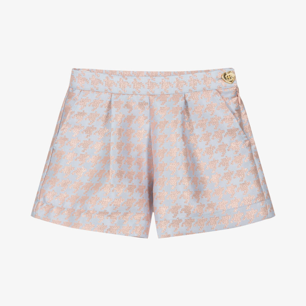 Gorgeous blue shorts for girls by Angel's Face, woven in soft jacquard. Crafted with a shimmery rose gold houndstooth design, they have smart pleats on the front for a tailored finish and useful adjustable waist. They seamlessly fasten with a concealed zip on the side and have a branded gold heart button for a stylish finish.