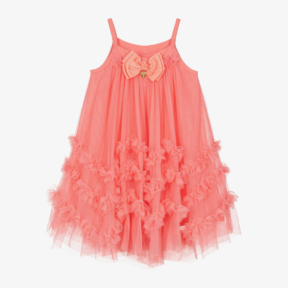Coral pink dress for girls by Angel's Face, lined in soft jersey for comfort. Ideal for a party, this voluminous dress is made with layers of tulle with cute, gathered ruffles. The label's signature bow and heart charm is appliquéd on the bodice, completing the look with a glamorous, designer touch.