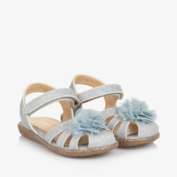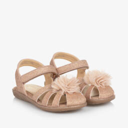 Gorgeous, glittery rose gold sandals for girls by Angel's Face. Ideal for a special occasion, this pretty style has a tulle flower appliqué on the toes and an easy-to-use velcro fastening strap. The faux leather insole is lightly padded for comfort and the non-slip rubber outer sole provides good grip.