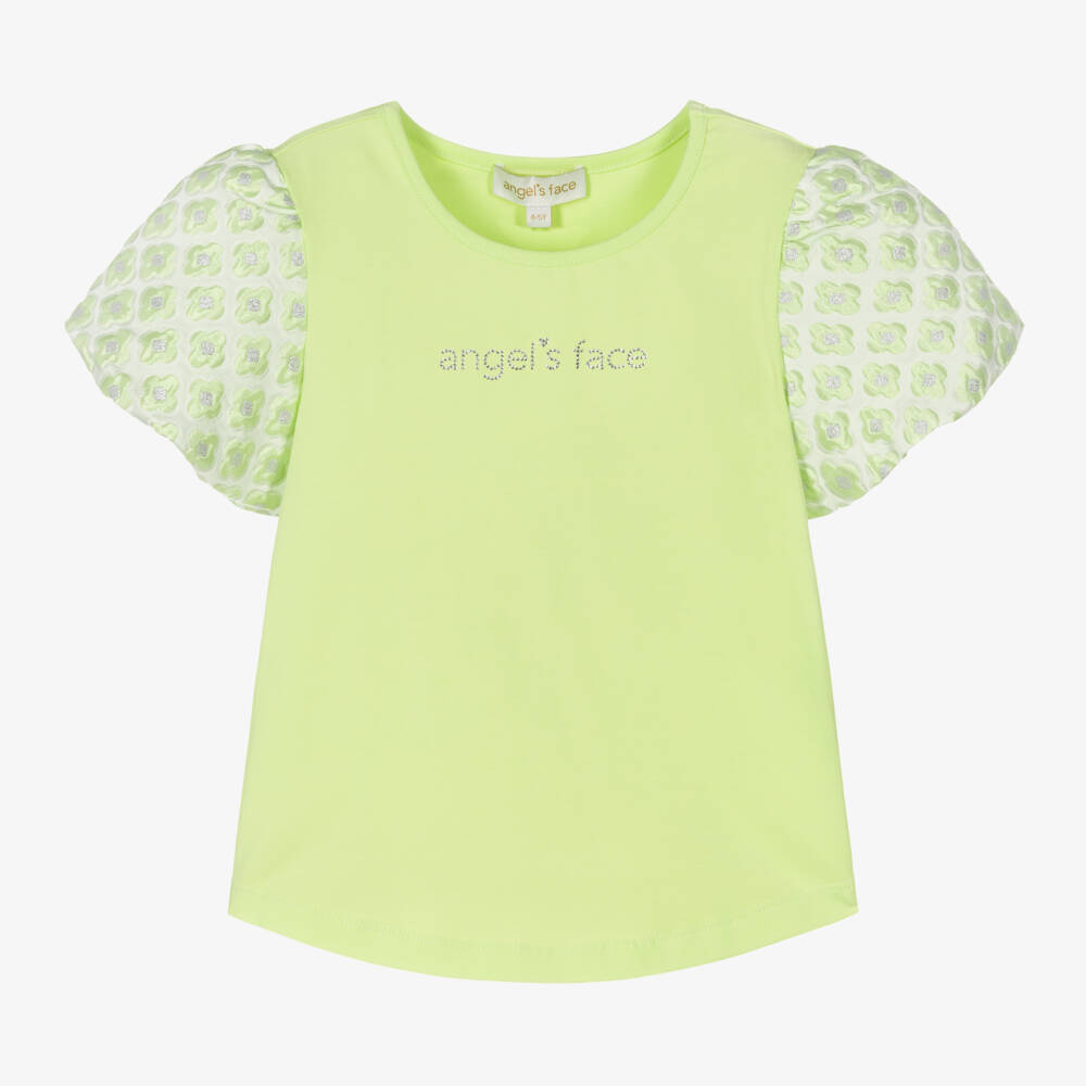 Girls green T-shirt by Angel's Face, with lovely puff brocade sleeve detail. The sleeves are in white with a green floral raised pattern. The front has a sparkly diamanté logo decoration to add a further touch of glamour.