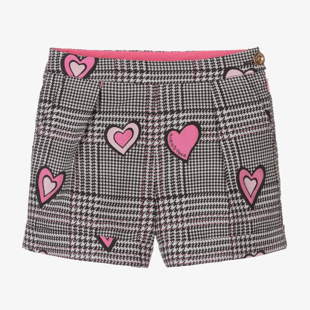 Fun, eye-catching shorts for girls by British brand Angel's Face. Soft and lightweight, they have a black, white and pink Prince of Wales check, patterned with pink and black jacquard hearts . There is a logo on one heart, with a golden logo button fastening and a neat, concealed zip on one side. The shorts have a useful, adjustable waistband, giving a good fit, side pockets, neat inverted pleats on the front and fixed turn-ups. They are lined in pink satin for comfort.