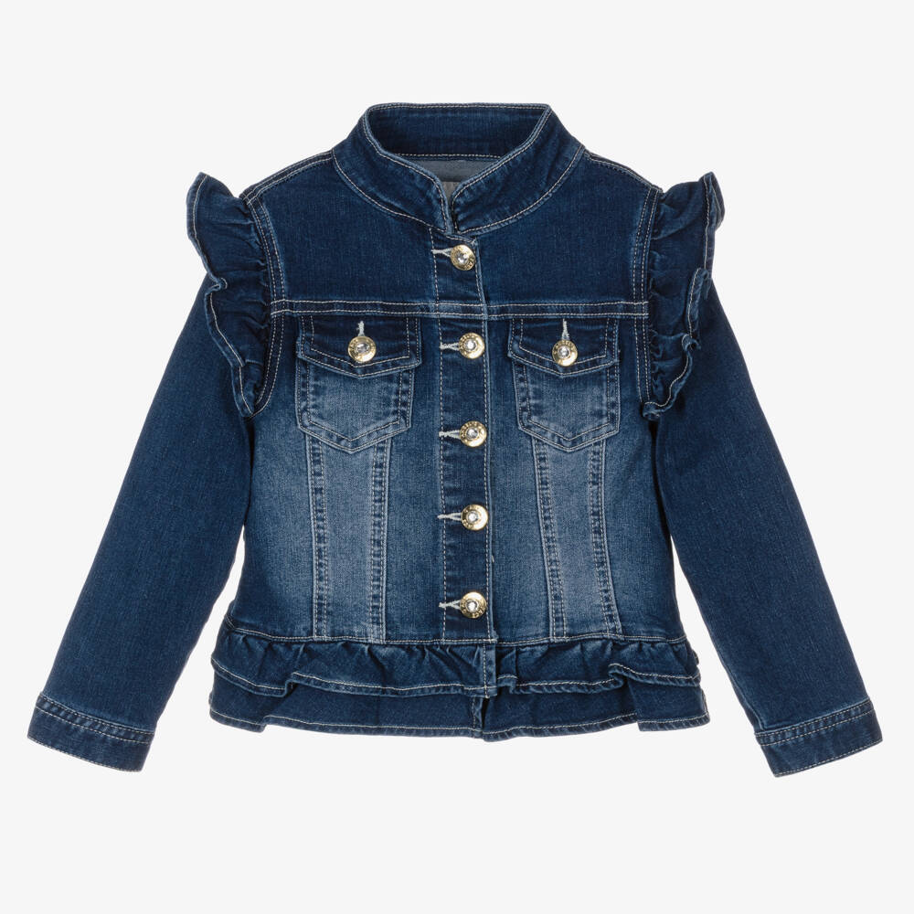 Indigo blue denim jacket for girls by British brand Angel's Face, made in a soft cotton blend. With a washed, faded look, the front is decorated with contrast white stitching and ruffle trims. Glamorous gold buttons with sparkling silver diamantés decorate and fasten this stylish layering piece.