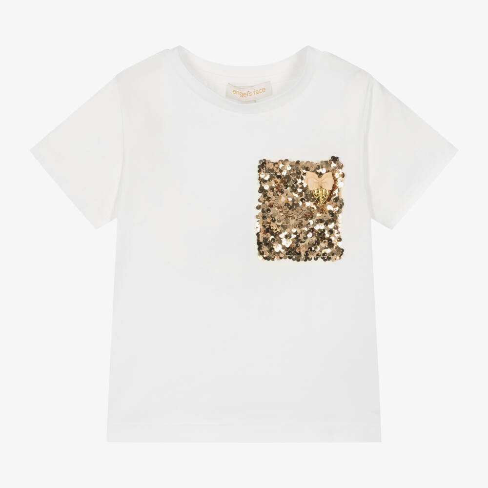 A lovely ivory short-sleeved T-shirt for girls by Angel's Face, made from soft and stretchy cotton jersey. Embellished with an iconic grosgrain ribbon bow and angel wings charm, it has a glamorous gold sequinned patch pocket on chest for an added touch of sparkle.