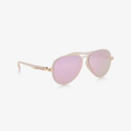 Girls light pink aviator-style sunglasses by Angel's Face. They feature mirrored lenses with UV 400 sun protection and a sleek pink frame. The brand's signature gold-tone bow logo adds a touch of elegance to the arms.
