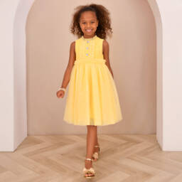 This elegant pale blue dress for girls by Angel's Face will make a fabulous update to their special occasion wardrobes. It has a fitted bodice made in soft, sparkly tweed, with faux crystal button detailing and ruffled trims. The full, gathered tulle skirt has a comfortable cotton voile lining with a tulle frill for lots of volume.