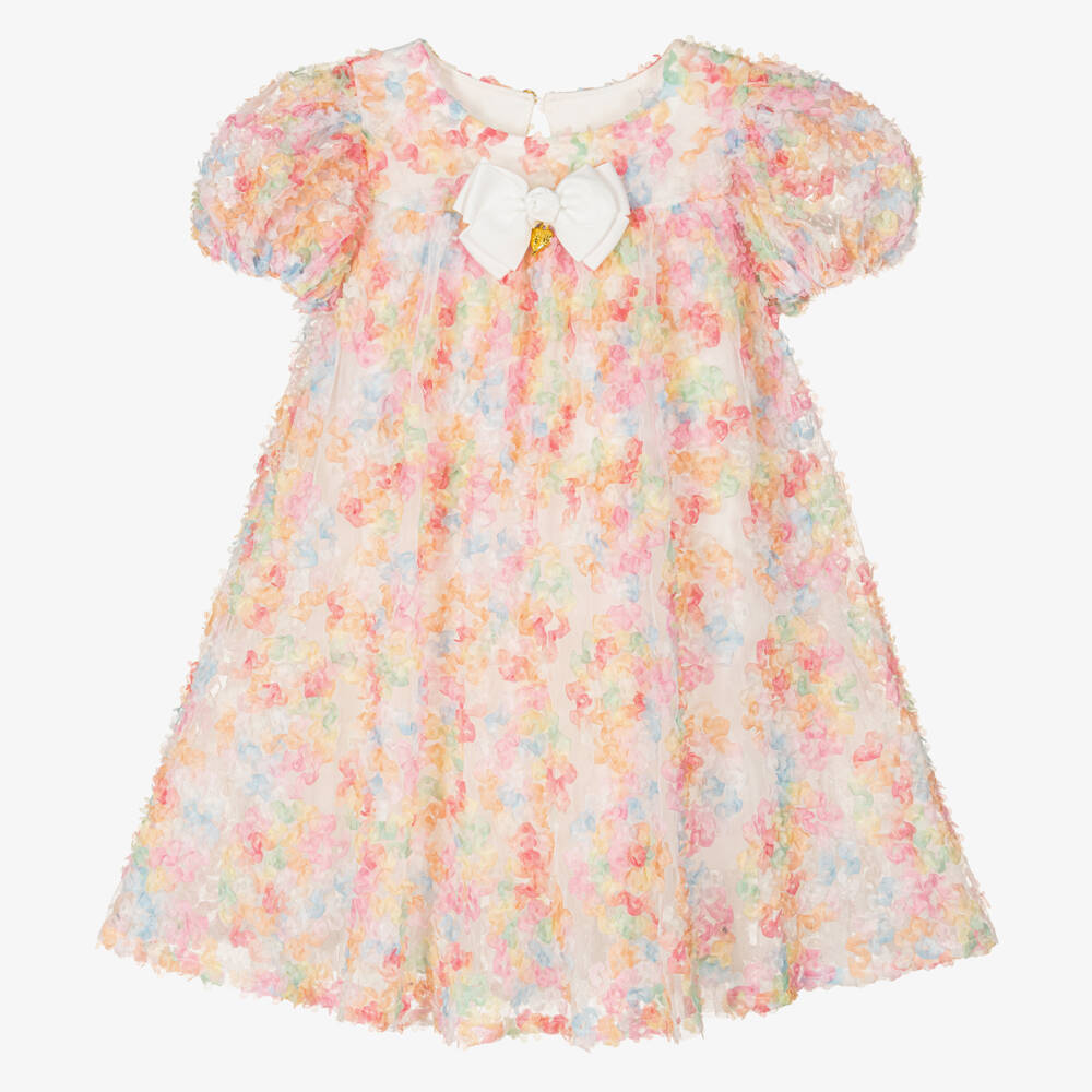 Gorgeous pink dress for girls by British designer Angel's Face. Made with soft, gathered tulle in beautiful pastel shades, it has a voluminous, flared shape and dramatic puffed sleeves. There is a soft cotton jersey lining for comfort and a keyhole button fastening on the back for stylish dressing. To complete the look with a touch of branded glamour, it has the label's signature bow and heart charm on the bodice.