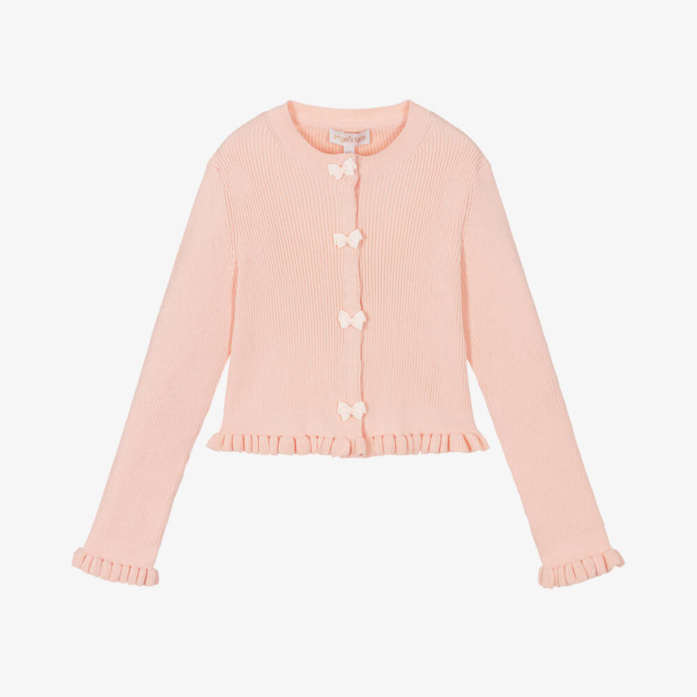 Peach pink cardigan for girls by Angel's Face, knitted in soft, ribbed cotton. This lovely layering piece has frilled edging on the hem and cuffs and fastens with poppers on the front. These are concealed behind pretty grosgrain ribbon bows.