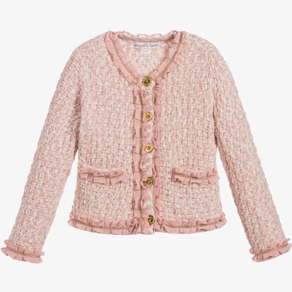 Knitted in a soft cotton blend, this elegant pink jacket by Angel's Face is a lovely choice for when a light, smart layer is required. Trimmed with pink chiffon frills and gold braid, it fastens with shiny gold buttons for a snug, cosy fit.