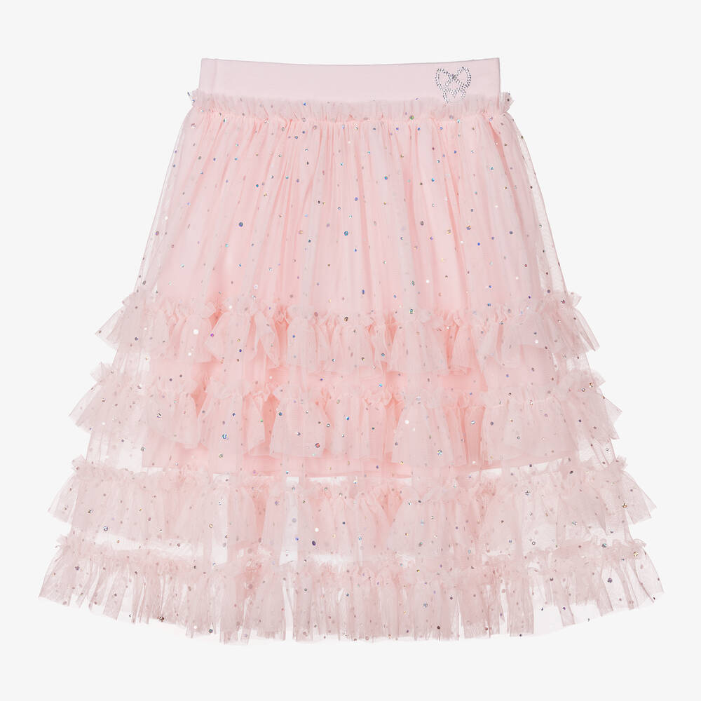 So pretty and fun for girls, this pale pink tulle skirt is by British brand, Angel's Face. Soft and lightweight with tiers of tulle ruffles, the scattered iridescent polka dot pattern adds shimmery sparkles to this girly look. It is designed with a knee-length cotton jersey underskirt, showing a sheer hemline on this midi-length skirt. The elasticated waistband has a diamanté bow and logo motif, a signature of the brand.