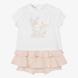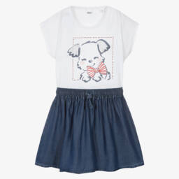 This pink skirt set for girls by Angel's Face, is a fun choice for a special occasion or party. Both stylish and comfortable, the cotton jersey top features a delicate ruffled tulle panel at the neckline, patterned with black polka dots and trimmed with a velvet bow and the brand's signature logo charm. Adorned with ruffles, the coordinating tutu-style skirt adds a playful finishing touch. Lined in soft jersey, it has a comfortable elasticated waistband.