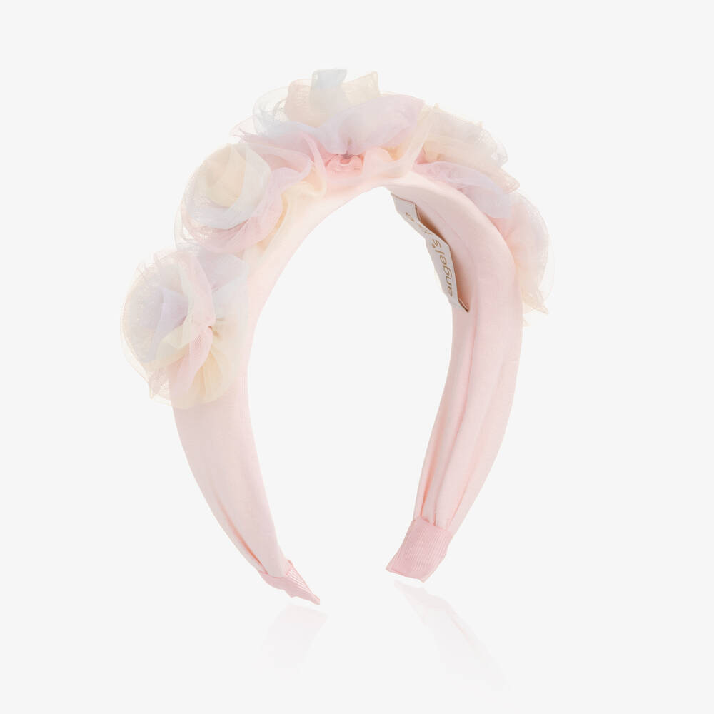A lovely pale pink hairband for girls by Angel's Face. It is decorated with soft rainbow coloured tulle flowers on the top, adding a gorgeous finishing touch to any outfit. Covered in soft jersey, the wide, flexible band sits comfortably on the head.