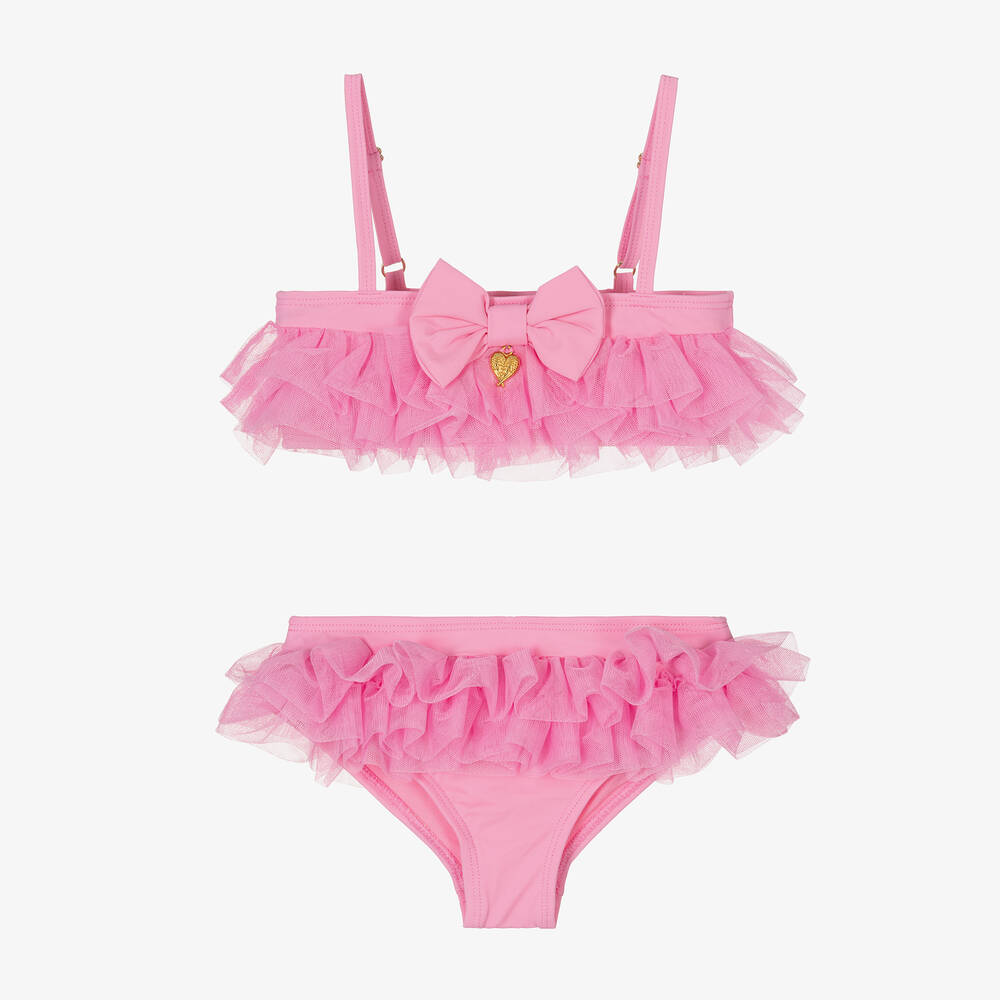 A pretty rose pink bikini for girls by British designer Angel's Face, made in silky, stretchy fabric and trimmed with layers of gorgeous tulle ruffes. The top has the brand's signature golden wings charm and bow stitched on the front, with adjustable shoulder straps for a good fit. The matching bottoms have a gently elasticated waist, and both pieces are fully lined for comfort.