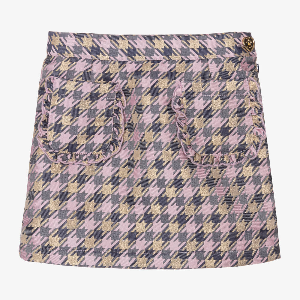 Gorgeous houndstooth skirt for girls by Angel's Face, in lilac purple, shimmery gold and navy blue. Made in satin jacquard, it has feminine ruffle-trimmed pockets and a side zip fastening with a glamorous gold heart logo button. The skirt is lined in soft crêpe chiffon and has an adjustable waist for a comfortable fit.