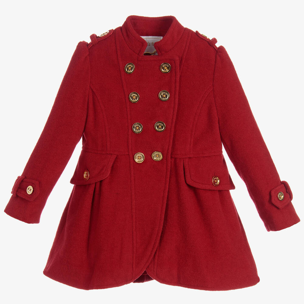 Made in a soft feel wool blend, this smart red coat for girls, is designed by Angel's Face. In a military style, there are shiny gold trims and buttons to fasten, with matching buttons on the cuffs and pocket flaps. It has a gently fitted waist and flare, with a luxurious red satin lining.