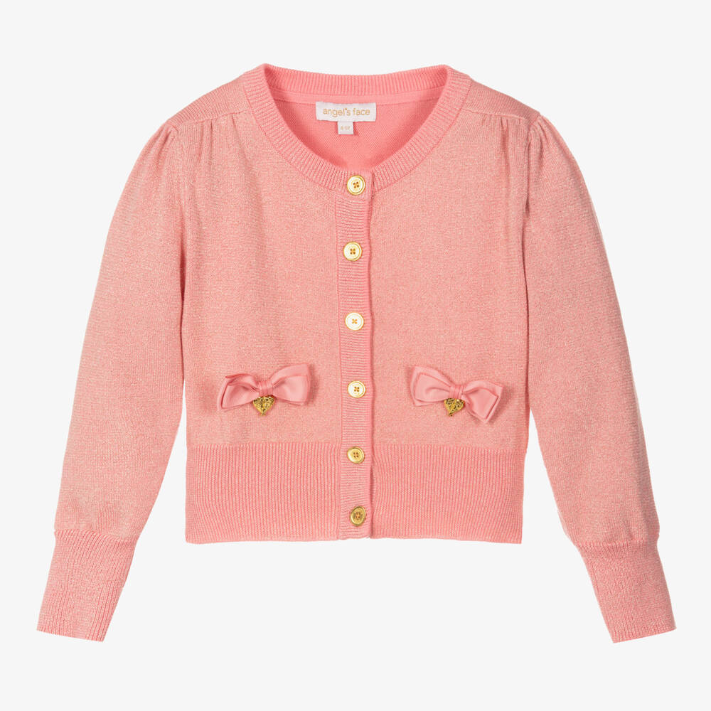 Sparkly coral pink cardigan for girls by British brand Angel's Face, with the designer's signature golden heart logo charm and grosgrain bow on each side. There are feminine gathers on the shoulders, prettily puffed, long sleeves and shiny gold logo button fastenings on the front. It is knitted in a lightweight, comfortable cotton blend with deep ribbed trims that are both stylish and comfortable.