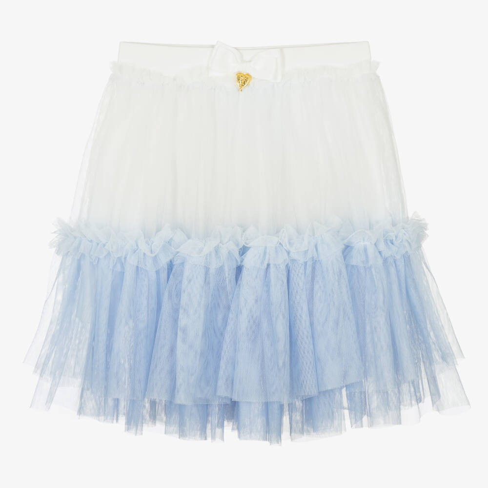 Beautiful off-white and blue tutu skirt for girls by British brand Angel's Face. In a unique blue ombré design, the voluminous skirt is made with layers of soft tulle for a special party look. The designer's golden wings heart charm and grosgrain bow is sewn on the stretchy waistband for a touch of glamour.