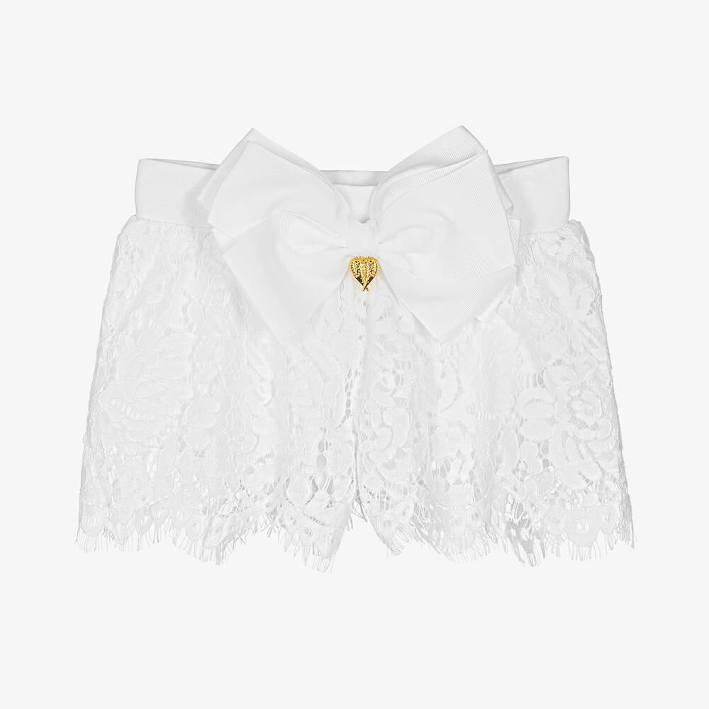 Wonderful off-white cotton shorts for girls by British brand Angel's Face, with the designer's over-sized, signature bow and gold heart charm on the gently elasticated waistband. Just right for a special occasion or for when only stylish will do, they are made in lovely lace with scalloped, eyelash trims. They are fully lined in jersey for comfort and are easy to wear, simply pulling up.